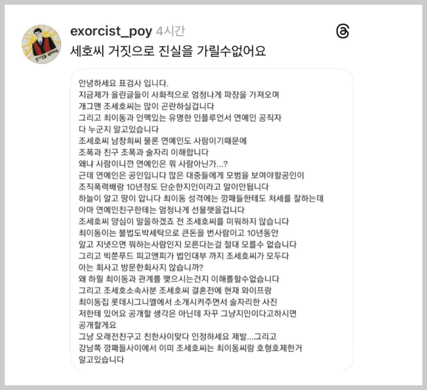 이번 논란은 이른바 ‘표검사’로 불리는 폭로 계정이 SNS에 올린 글과 사진에서 시작됐습니다. 폭로자는 경남 거창 기반 조직폭력배 최 모 씨를 거론하며, 이 인물과 방송인 조세호가 오랜 기간 가까운 사이였고, 불법도박 사이트·프랜차이즈 사업·고가 선물 수수 등이 얽혀 있다는 주장을 연달아 올렸습니다.