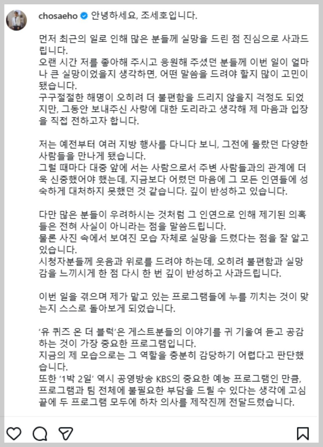 하지만 폭로가 이어지면서 여론이 악화되자, 조세호는 결국 tvN <유 퀴즈 온 더 블럭>과 KBS2 <1박 2일> 시즌4에서 하차 결정을 발표했습니다. 그는 “의혹은 사실이 아니지만, 사진과 인맥 관리에서 실망을 안겨드린 점을 반성한다”는 취지의 입장을 내놓았습니다.