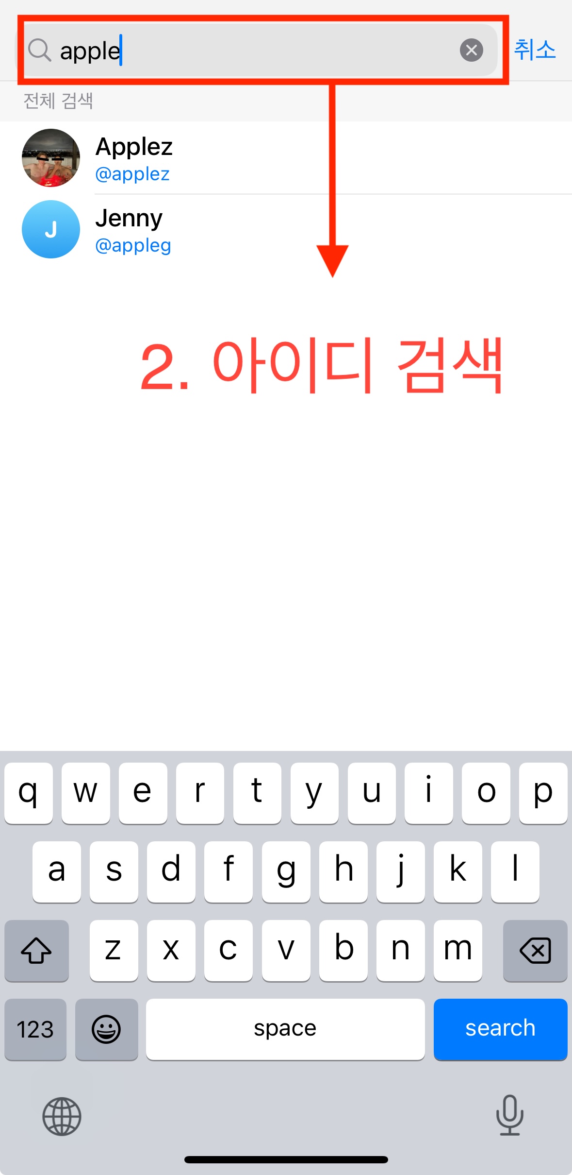 - 친구가 알려준 텔레그램 아이디를 검색창에 입력합니다.