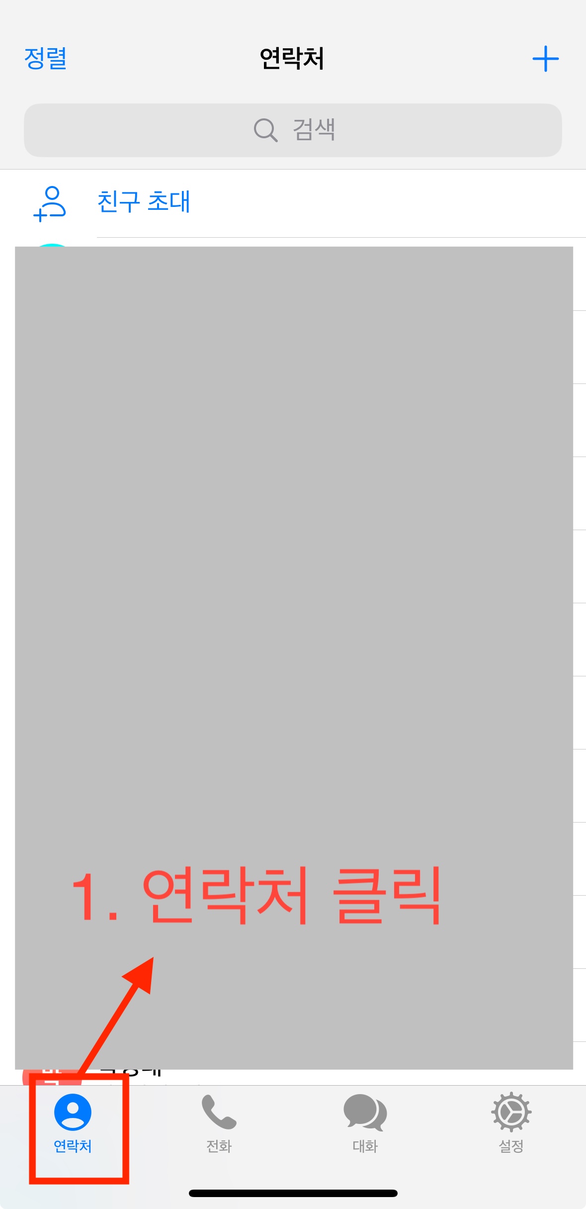 - 텔레그램 앱을 실행하면 하단에 연락처 버튼을 누르면 상단에 돋보기 아이콘과 검색창이 보입니다.